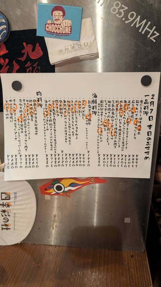おすすめ料理の”刺身三点盛り“の内容が変わり、”アイナメ刺し“、“カマス刺し”、”イワシ刺しネギたまり和え“、“生海老とうるいの梅ネギ味噌和え”、”ローストビーフ赤ワインソース“、“厚切り豚タンと茄子のガーリックレモンペッパー炒め”、“松山揚げ牛バラと椎茸の牛だし煮“、”鳳凰卵のチーズインオムレツあさりとベーコンのガーリックトマトソース“が新たに加わり、“チキンステーキおろしソース“がお求めやすい価格になりました!